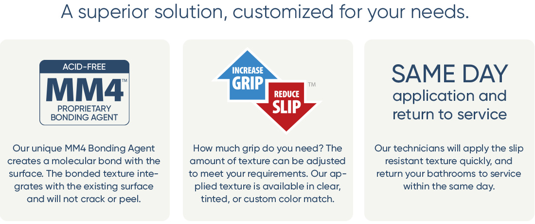 Our superior non-slip solution is a granular texture that is bonded onto your existing bathroom surfaces. Our unique anti-slip surface can be adjusted to meet your needs and will exceed industry standards for slip resistance in wet environments. Reduce slip and fall liability in your facility.